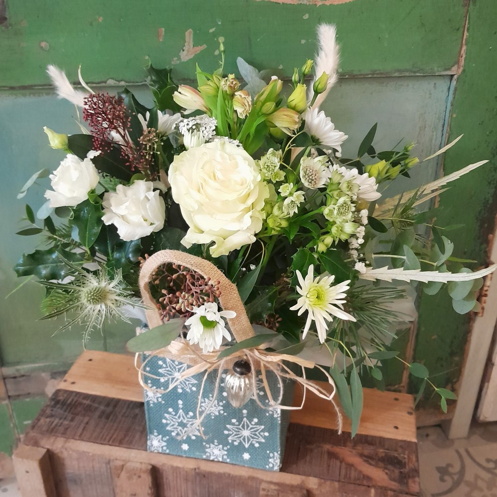 A cool and calm arrangement of fresh flowers in a white, cream and green shades. We will select the freshest flowers for this design and arrange them in water holding florist foam, inside a grey and white snowflake printed bag. This makes a natural and informal styled gift, which requires no further re arranging by the recipient. These bag style gifts are always very popular and should last from christmas until New Year. The white theme goes with any room style or colourscheme and makes a nice change from the more traditional red shades. Trimmed with feathery plumes, white foliages or berries and a natural raffia ribbon to complete the Scandi look. I often include varieties such as roses, lizianthus, alstromeria, spray carnations, carnations, thistles, gypsophila, freesia to name but a few.